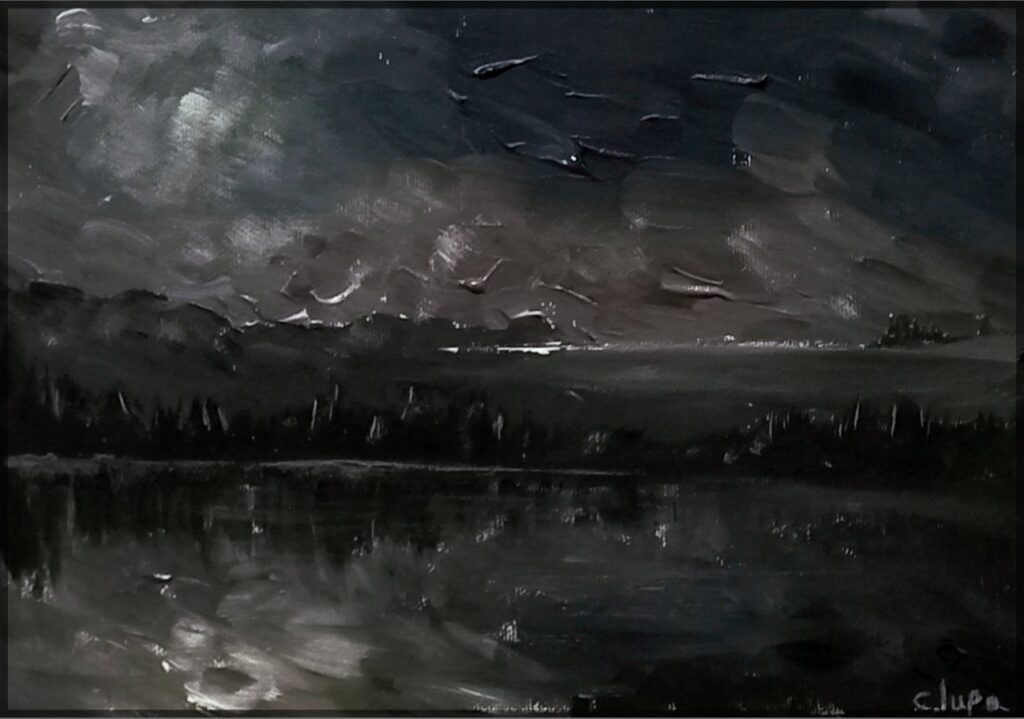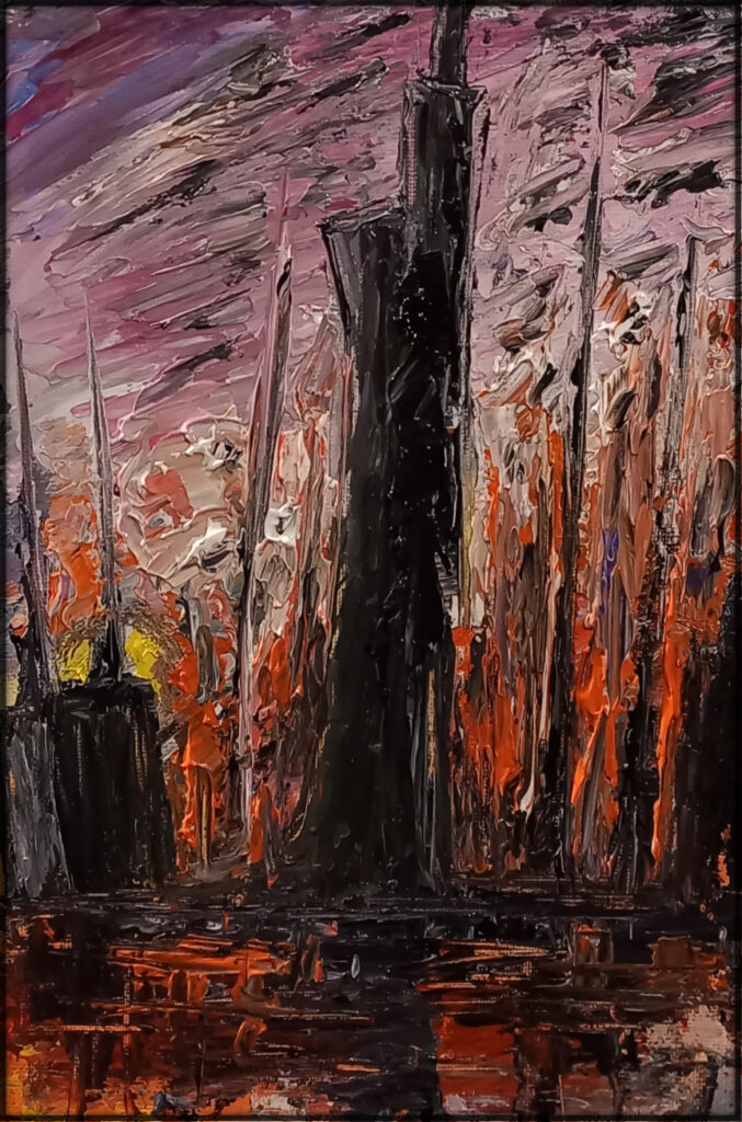 Do niniejszego obrazu zainspirowały mnie wspomnienia z czasów studenckich, gdy po nocy wykańczania projektu wychodziłem przejść się, aby zachować jakąś higienę umysłu. Pamiętam, że wówczas lubiłem obserwować budynki, które na tle wschodzącego słońca były czasami zupełnie czarne. Niskie wyglądały jak krasnale na tle wysokich i szczupłych wieżowców.